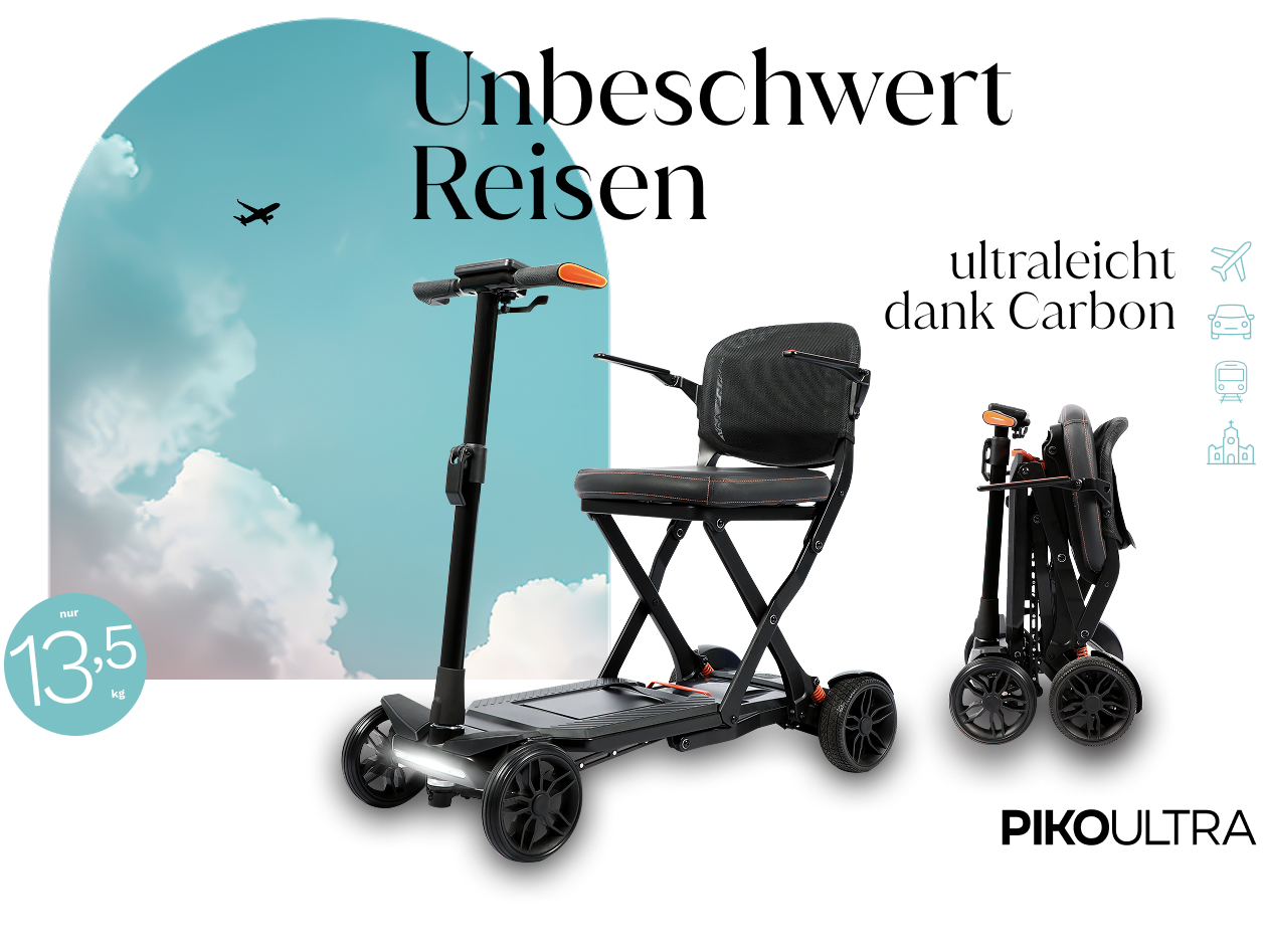 PIKOULTRA ist ein faltbares, flugzeugtaugliches Elektromobil mit nur 13,5 kg! PIKOULTRA ist ultraleicht dank Carbon und stabil und komfortabel dank Hinterrad- und Sitzfederung! PIKOULTRA ist für Menschen mit Mobilitäts-einschränkungen, die Flugzeug, Auto, Bus oder Bahn uneingeschränkt nutzen und Ihre Leben genießen wollen.